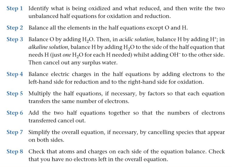 Ja, men du ser! Där står det till och med att du ska använda halvcellsmetoden (half equation = halvcell eller delförlopp på svenska). Den metoden är i princip praxis på universitetet medan oxidationstalsmetoden dominerar på gymnasiet. Jag tror att det just beror på att man behöver räkna på reaktionerna i högre grad på universitetet och då är halvcellsmetoden (som nämnt i föregående inlägg) enklare.