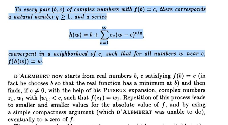 d'Alembert använde Puiseuxserier för att motivera punkt 2. Jag *tror* att utdraget nedan förklarar hur, men ärligt talat är jag inte riktigt med själv. Men poängen verkar vara att om något y (dvs P(z)) är minst i sin omgivning och dessutom inte noll så får man en motsägelse.