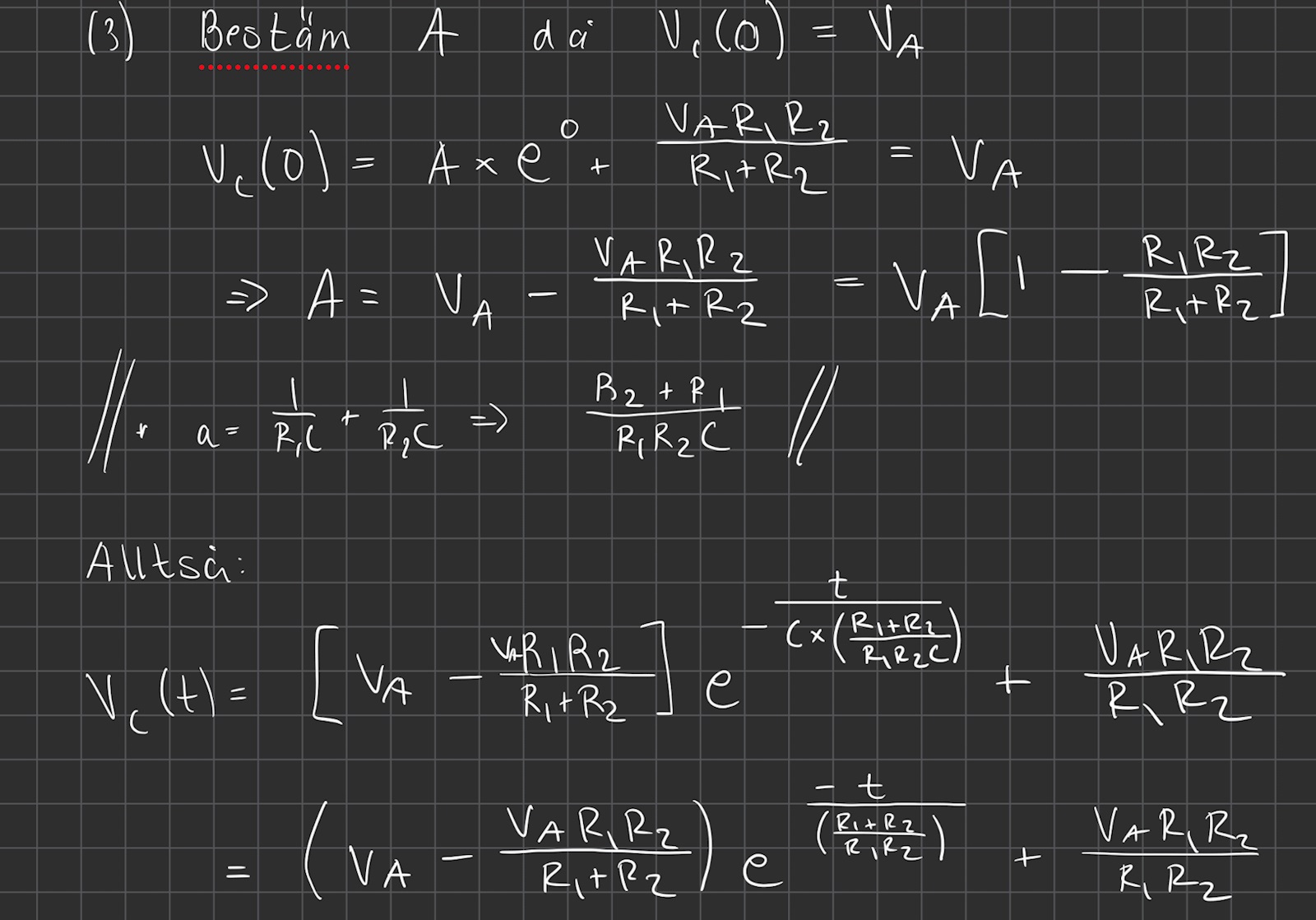 För att bestämma A så använder jag mig av begynnelsevillkoret att Vc(0) = VA , och får då: