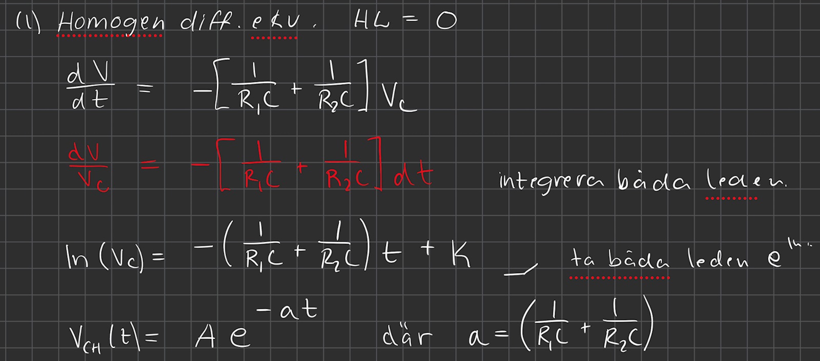 Denna ekvation fick jag också fram i mitt första försök när jag använde KCL och Ohms lag, men hur går man vidare på enklast sätt? För att lösa differentialekvationen så tänker jag att jag vill jag ta fram den homogena differentialekvationen + partikulärlösningen. För den homogena får jag:
