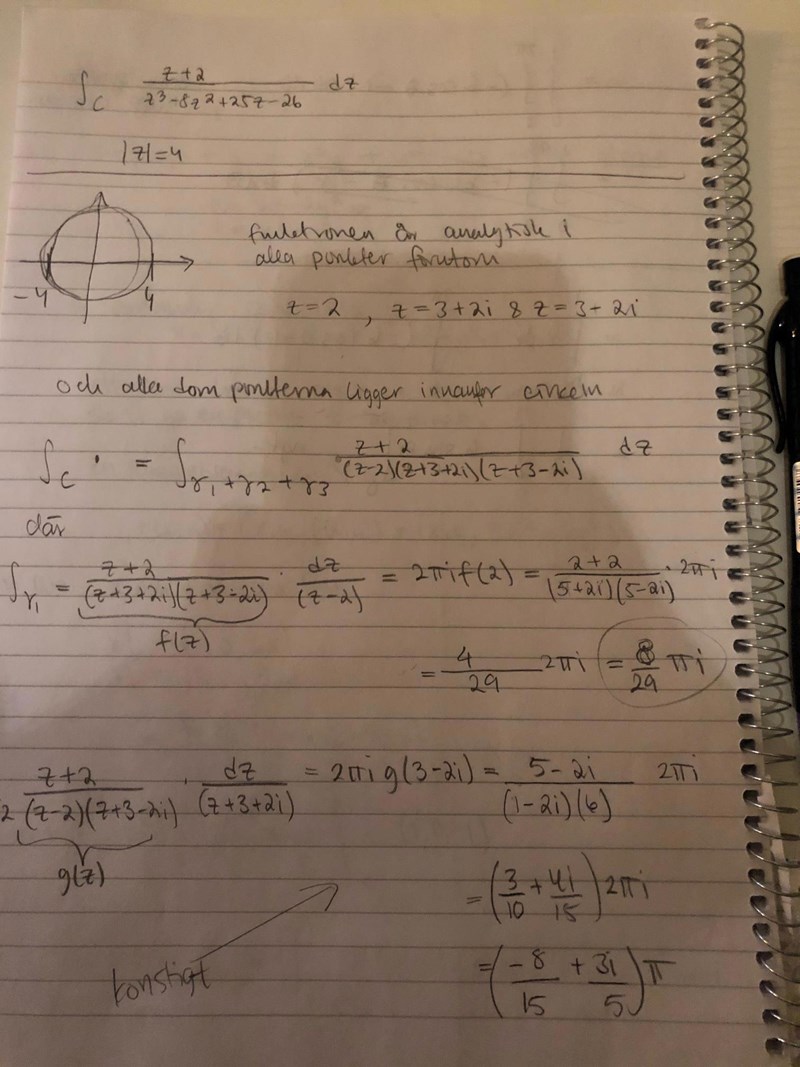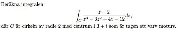 R0BRT skrev:Du kan inte definiera f(z) på det viset. Funktionen f(z) måste vara analytisk i hela det slutna området som definieras av din kurva C. Ett sätt att lösa integralen på är att partialbråksuppdela med komplexa faktorer och lösa de tre separata integralerna som borde komma från partialbråksuppdelningen.