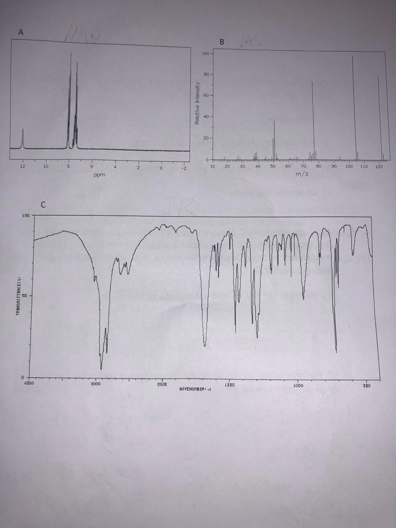 Vid analys av en okänd förening körde man IR; NMR och MS på föreningen och fick följande spektra A-C (se bild).