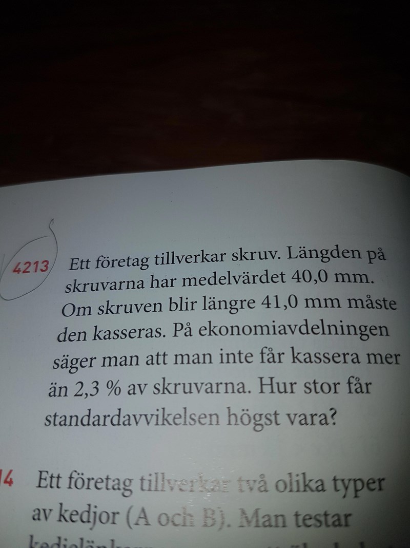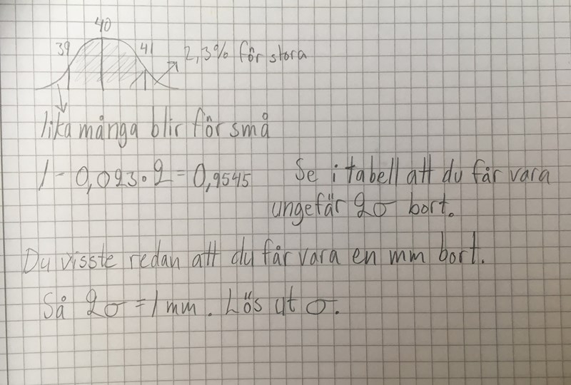 Sannolikheten att en skruvs längd är mer än 41 millimeter måste vara mindre än 0.023 för att ekonomiavdelningen ska bli nöjd. Om 41 millimeter är mer än 2 stycken standardavvikelser från medellöngden så uppnås detta krav, eftersom tabellen visar att sannolikheten då är mindre än (1-0.9545)/2.