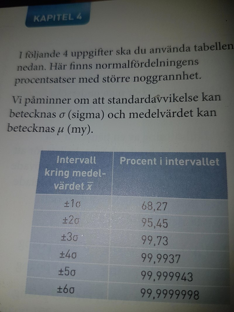 Tabellen beskriver hur stor del av utfallen som ligger inom ett visst intervall enligt normalfördelningen. Läs mer här: https://www.matteboken.se/lektioner/matte-2/statistik/normalfordelning