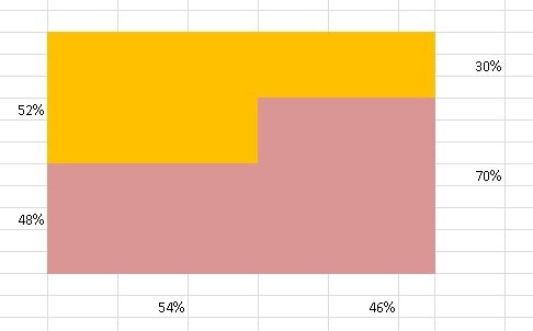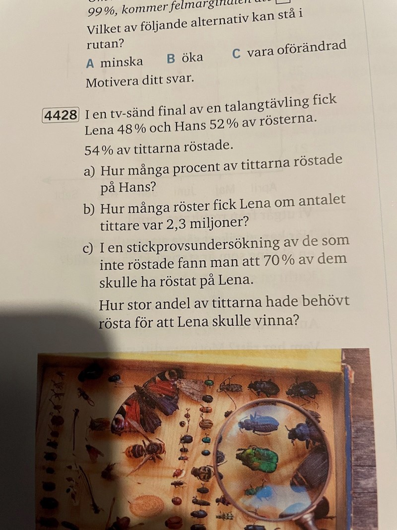 Försöker tänka… så delar man 46% i 2 så är 35%lena och 15% hans. 48 + 35 är 83% och 52+ 15 är 67. Okej så det blev för många, så då vet jag att det är många färre än hälften. 1/5 är 14 på 70 och 6 på 30.