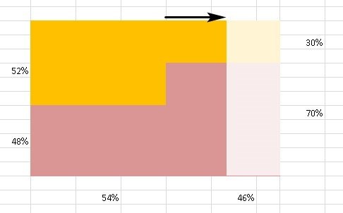 Ska titta närmare efter jobbet idag, men jag förstår inte den geometriska figuren. Om jag kortar ned din pil där eller gör den längre så förstår jag inte vad som händer. Jag förstår som förut att proportionerna blir annorlunda på något sätt men inte mer än så. Dom blir mer åt Lena än åt honom men hur jag utläser exakt hur mycket det är i % eller när hon får fler fattar jag inte.