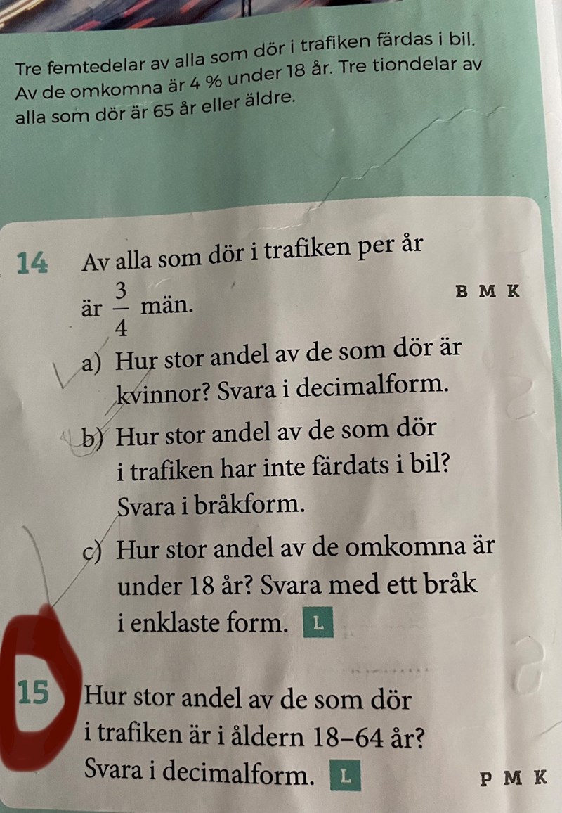 Hej! Du vet att andelen under 18 år som dör i trafiken är 4%=0,04 och att andelen 65 eller äldre är tre tiondelar=0,3. Andelen som är i åldern 18-64 motsvarar därför resterande andel. Alla andelar ska tillsammans bli 1=100%. Kommer du vidare nu?