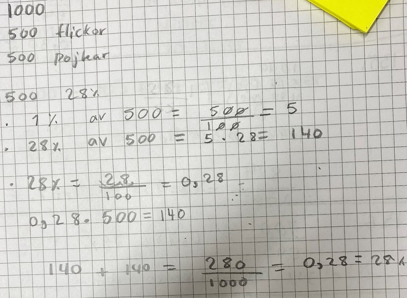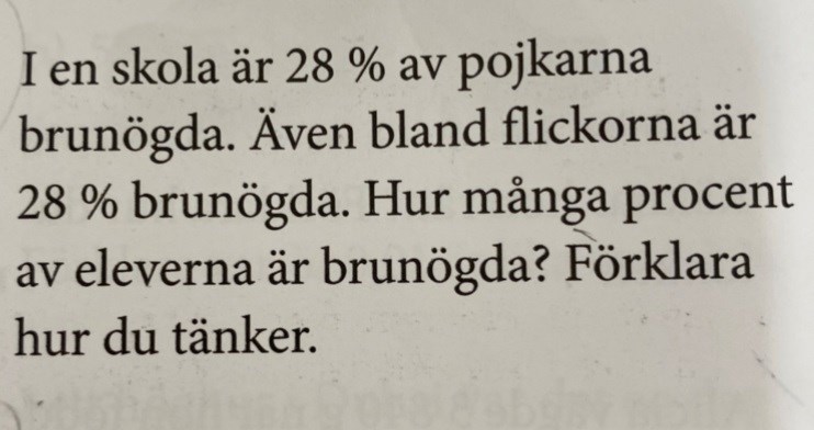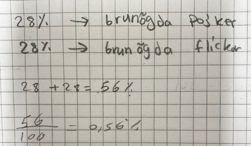 Smaragdalena skrev:Tänk dig att det går 1000 elever i skolan, hälften flickor och hälften pojkar. Hur många brunögda flickor finns det? Hur många brunögda pojkar finns det? Hur många brunögda elever finns det? Hur många procent av eleverna är brunögda?