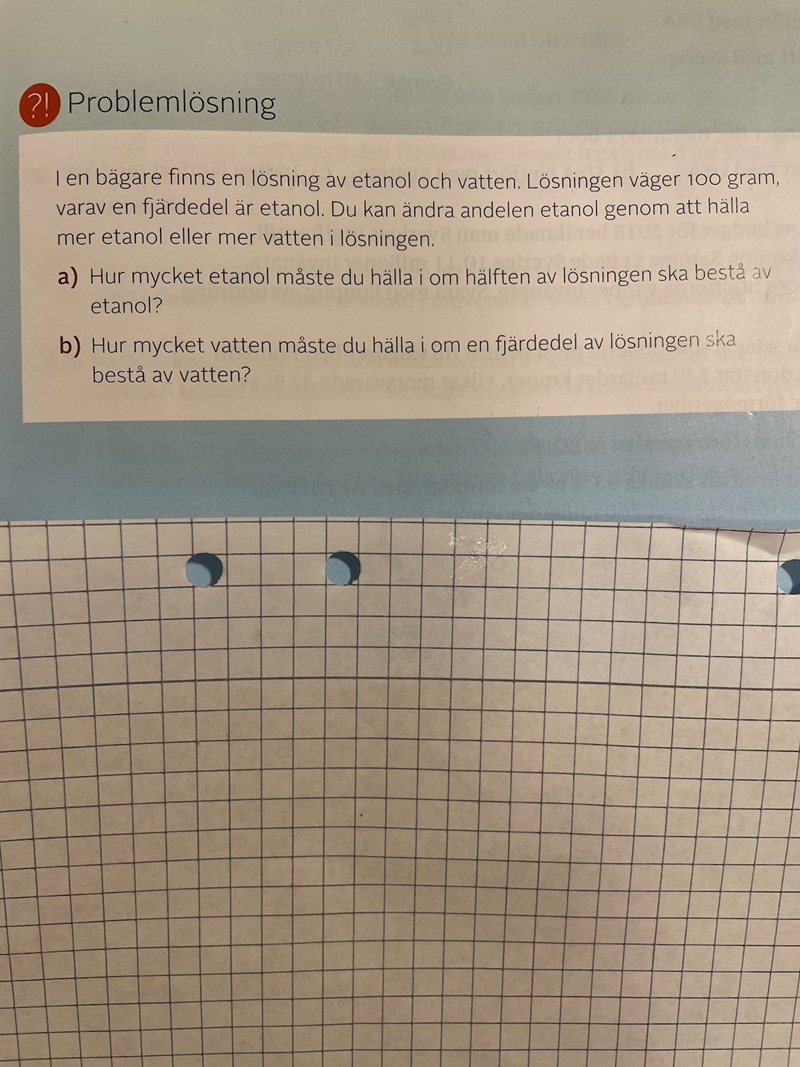 Hej, kanske är det jag som är ute och cyklar.. men tänker att upg B) bara går att lösa genom att tillsätta mer etanol och inte vatten.. eller har jag tolkat frågan fel?