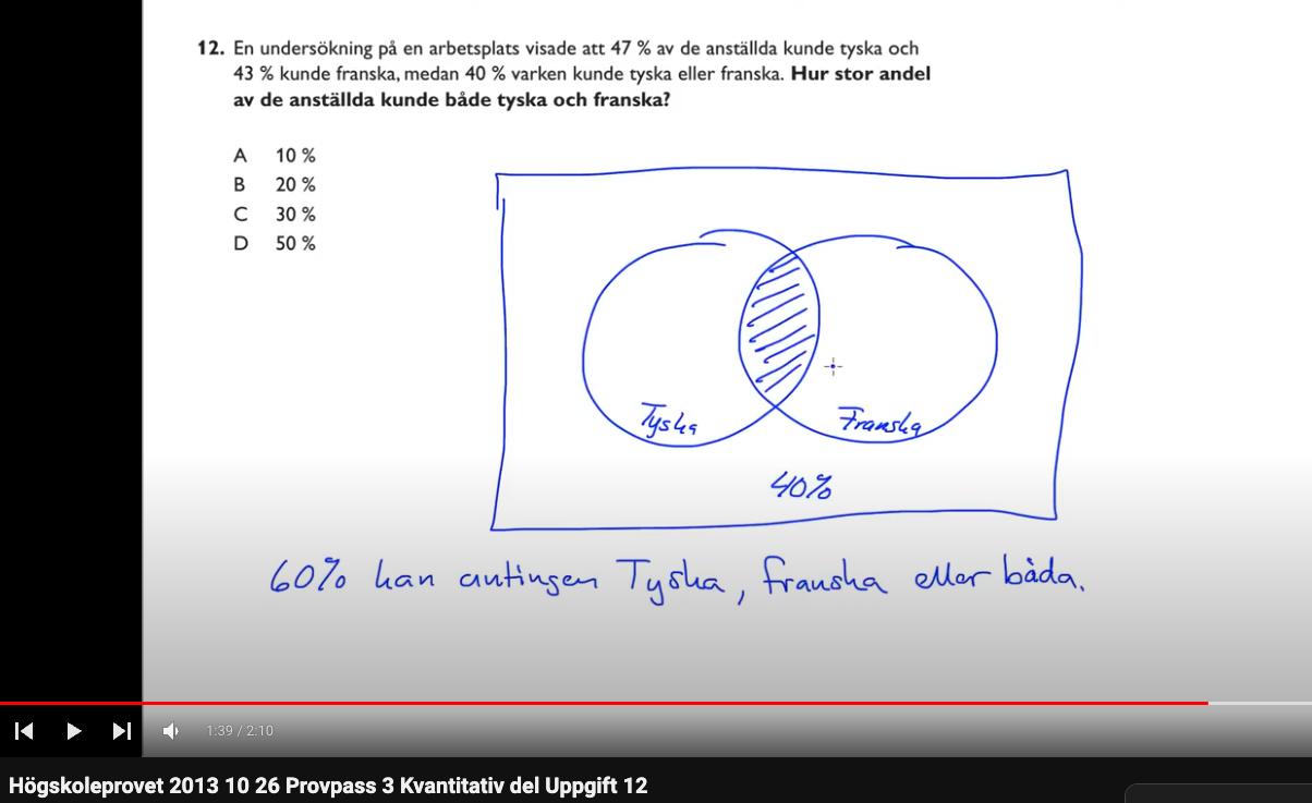 Tänk dig för enkelhets skull att det är 100 personer. 40 personer kan inget språk. 43 personer kan franska och 47 personer kan tyska. Detta är sammanlagt 130 personer - men det fanns ju bara 100 personer! Enda förklaringen är att vissa personer kan både franska och tyska och alltså har räknats två gånger. Hur många personer är det som har räknats två gånger?