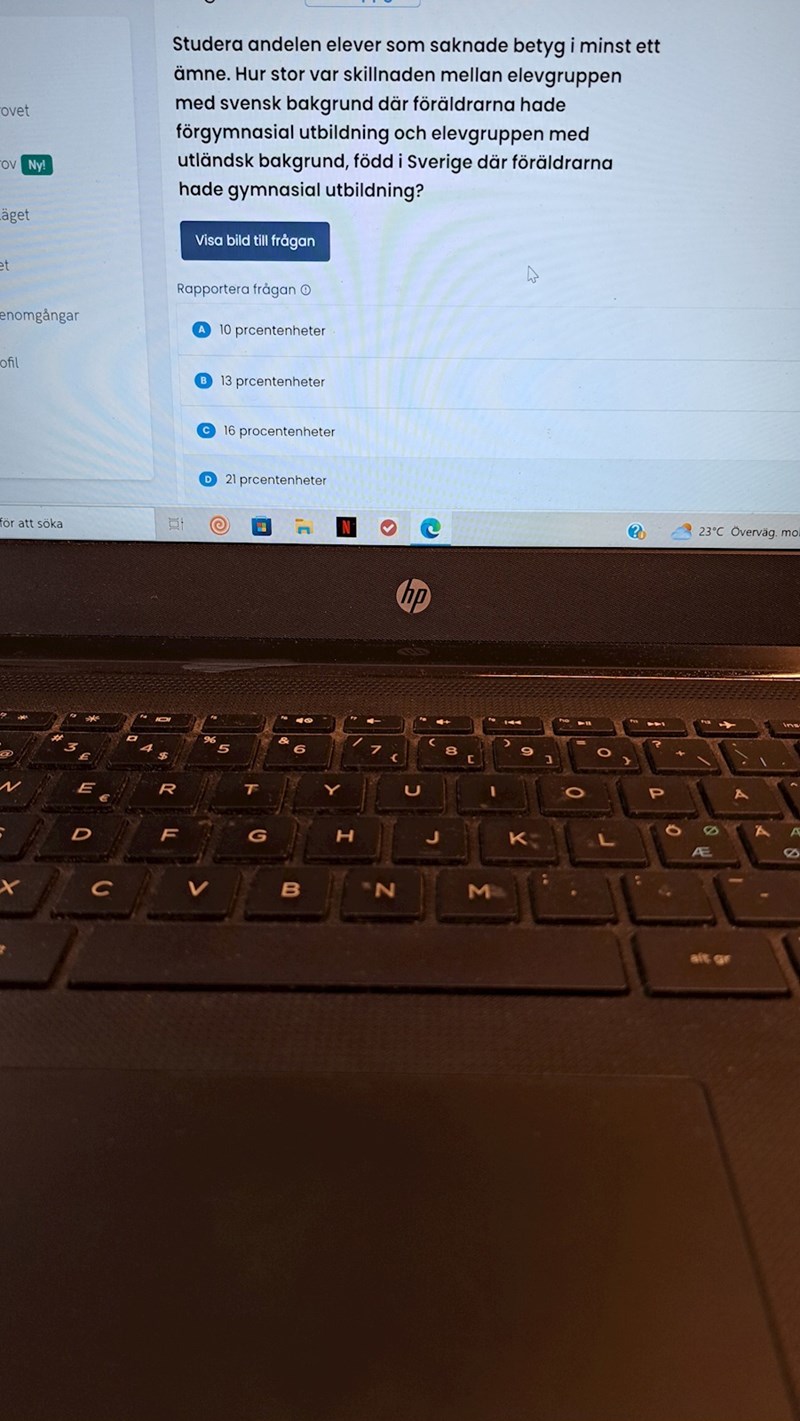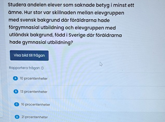 Rätt svar är C). Jag vet ej om nummerna som står på staplarna anger procent eller antal. Men jag antog att de gör det så jag tog skillnaden mellan svensk bakgrund och utländsk bakgrund dvs 26 procent gymnasial och 47 procent förgymnasial. Då fick jag 21 procent
