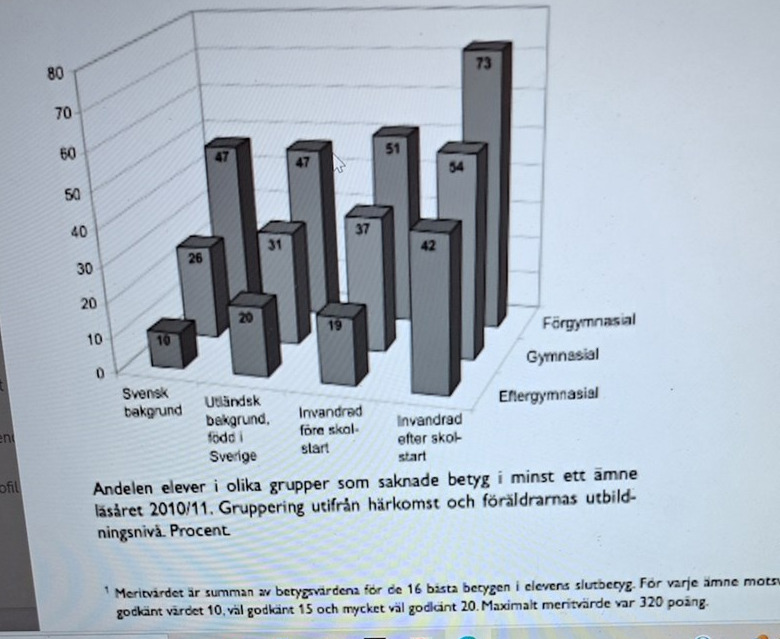 Av elevgruppen med utländsk bakgrund, född i Sverige, och där föräldrarna hade gymnasial utbildning saknade 31 % minst ett betyg.