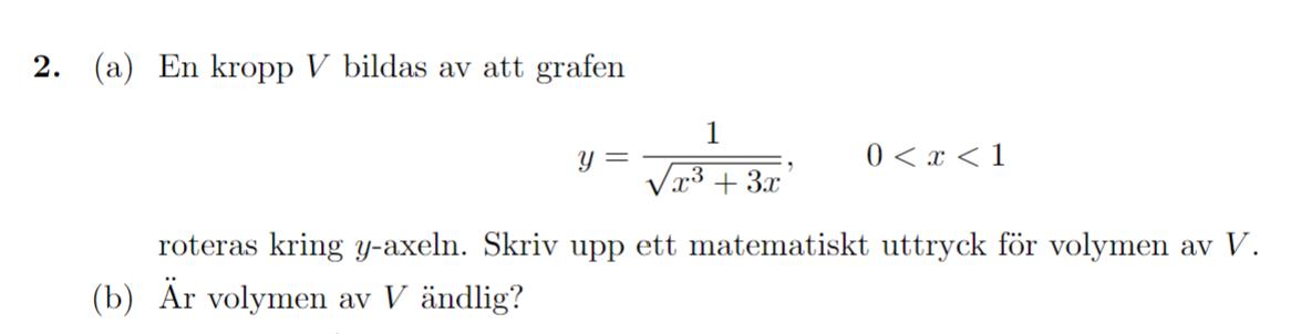 Hej! Jag har kört fast på fråga 2b). Jag tänker att man kan jämföra integralen med en annan större integral som är lättare att integrera på intervallet och se om den är konvergent eller ej, dvs enligt Kauchys integralkriterium. Problemet är att jag inte riktigt vet vilken lämplig integral jag kan testa med. Någon som kan hjälpa?