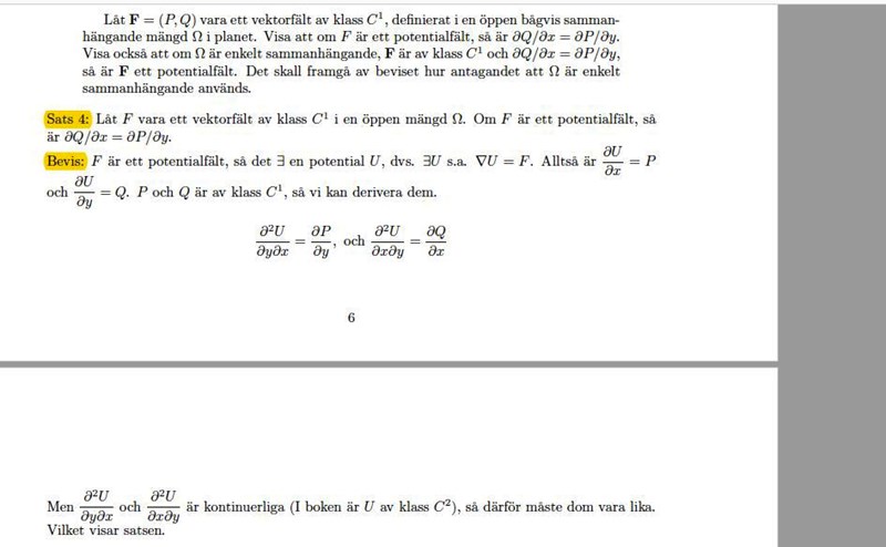 Eftersom och är av klass i området så följer det att potentialen är av klass i området , så då är de blandade partiella derivatorna och lika i det området. Men och så då måste det gälla att i området