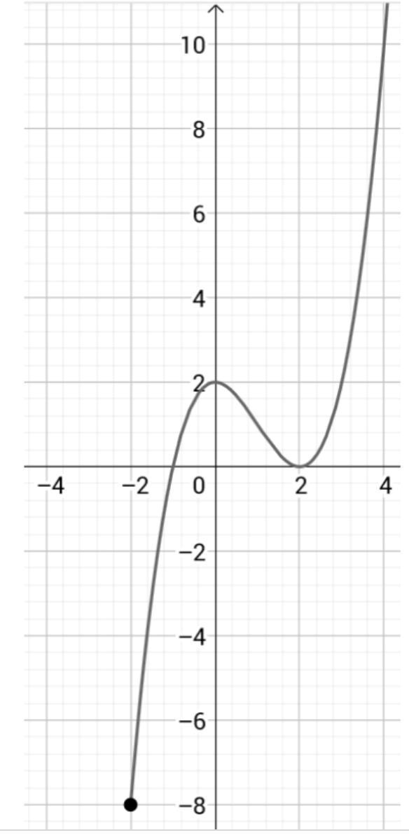 Du kan alltid skriva en tredjegradsfunktion som där a, b och c är funktionens nollställen. Du ser i grafen att a=b=2. Läs av två andra punkter på grafen och gör ett ekvationssystem.