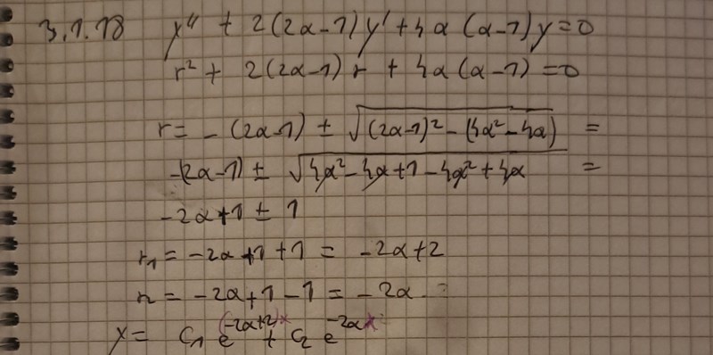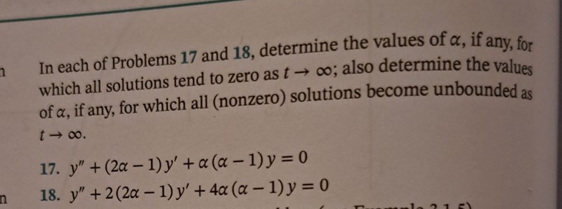 Om lösningen skall gå mot noll, så måste exponenterna i båda exponentialfunktionerna ha negativ koefficient. Den ena exponentialfunktionen har r1=-2α+2r_1 = -2\alpha + 2 i exponenten och den andra har r2=-2αr_2 = -2\alpha. Både r1<0r_1 < 0 och r2<0r_2 < 0 måste vara uppfyllt om du vill att y=c1er1t+c2er2t0y = c_1 e^{r_1t} + c_2 e^{r_2t} \to 0tt\to \infty