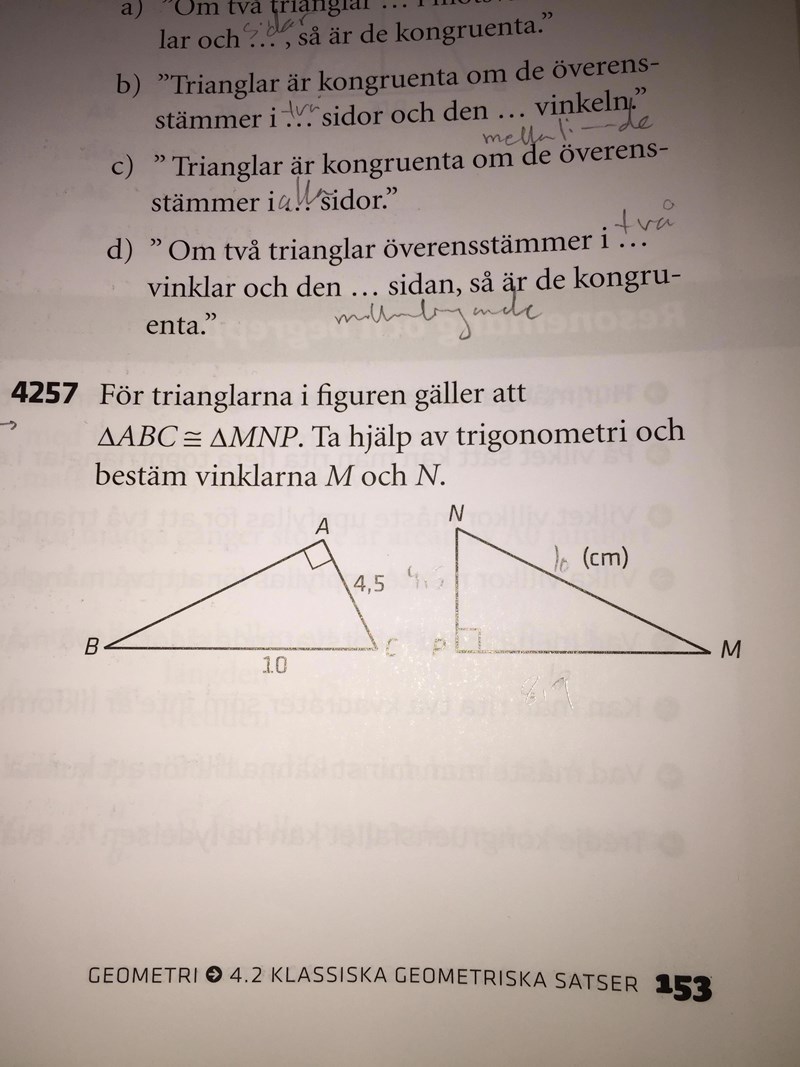 Jag tror att det finns ett tryckfel i uppgiften. "Vinkel MNP" skall nog vara"vinkel NMP". Men det spelar ingen större roll. Trianglarna är likformiga, det är det viktiga här.