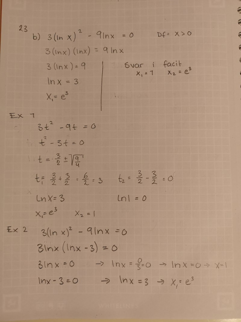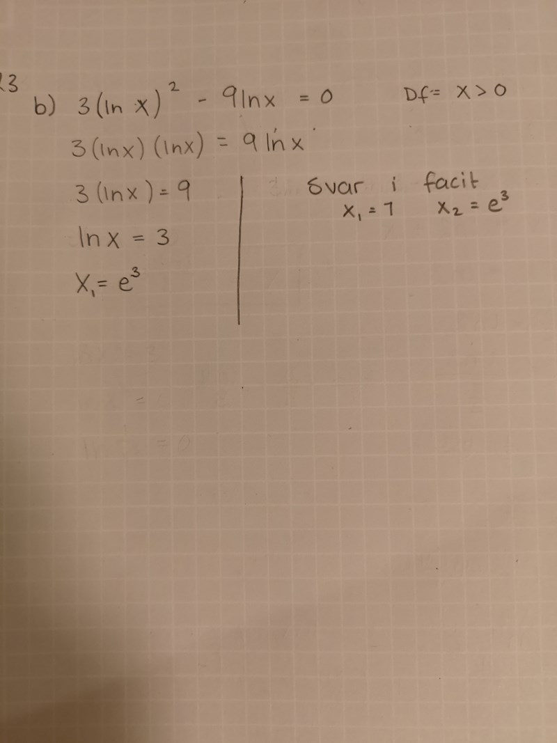 Lös detta med nollproduktmetoden d.v.s. antingen är 3 lnx = 0 eller lnx-3=0