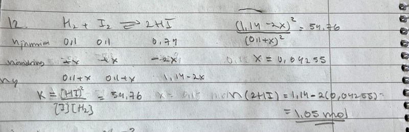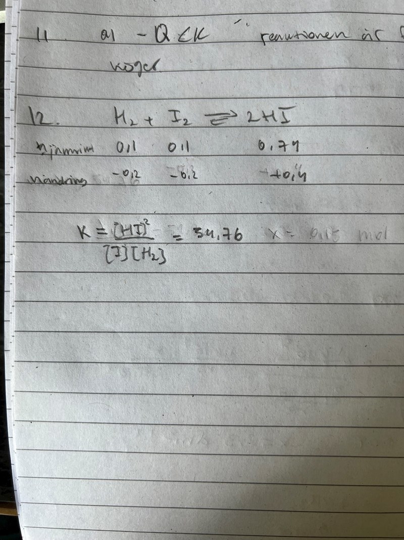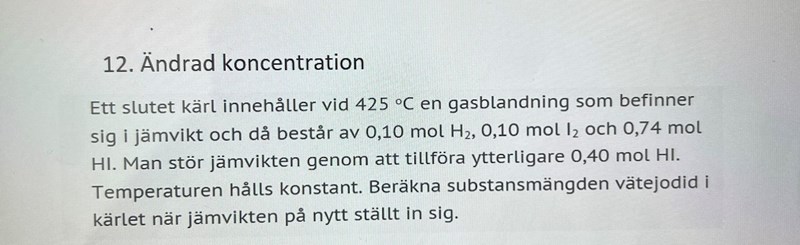 tänkte börja med att räkna ut den nya sustansmängden men får att resultanterna får en negativ substansmängd vilket inte går ihop. Jag räknade istället ut k värdet från den första jämvikten och jag vet inte hur jag ska ta mig vidare