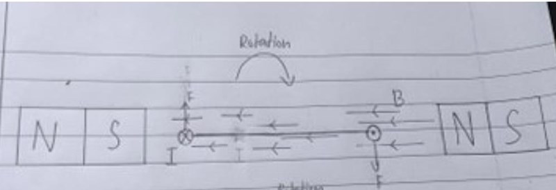 Det framgår inte från din fråga vad kontexten är, men jag uppfattar din bild som att det är en slinga som kan fås att rotera runt en axel som går i riktningen inåt-utåt från papperet mitt emellan magneterna, då man driver en ström genom slingan.