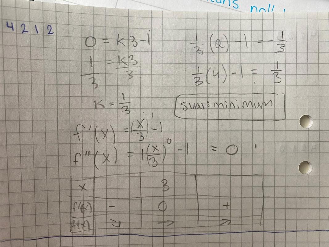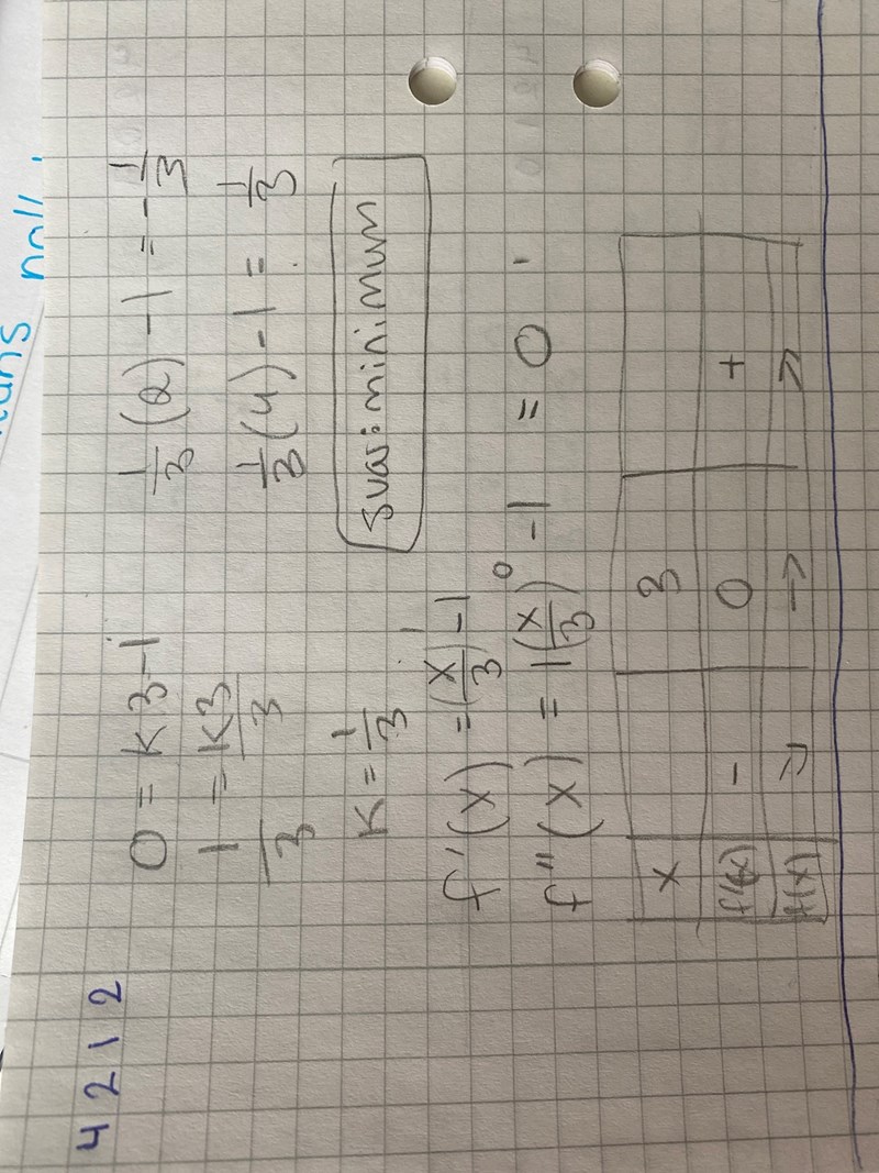 • Andraderivatan är f''(x) = 1/3. Här glömde du att derivatan av konstanten 1 är lika med 0.