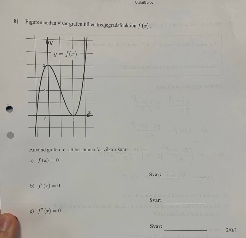 På b) svarade jag att f'(x) = 0 vid x=0 och x=1 där det är maximi och minimipunkt. Är inte symmetrilinjen samma värden? Dvs mellan berg och dalbanorna typ. Eller menar du att den ska ligga mellan x=0 och x=1 dvs x= 1/2 i inflektionspunkten?