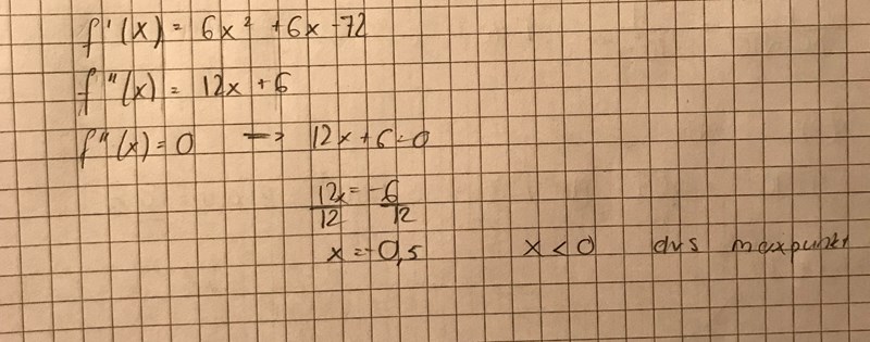 Om du sedan vill verifiera om det är en max eller minpunkt sätter du in detta värde i andraderivatan.