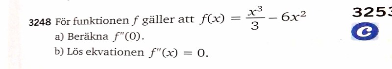 Hejsan, jag behöver hjälp med b) i uppgiften ovan. Jag trodde att man helt enkelt skulle lösa 18x-12=0 då f''(x) =18x-12, men det ger mig inte det svar jag vill ha, hur ska jag tänka istället?