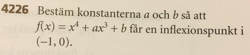 HT-Borås skrev :Du kan börja med att bestämma hur andraderivatan kan bli noll, för där är en inflexionspunkt. Du behöver också se till att funktionen går genom (-1,0). Teckentabell behövs egentligen inte.