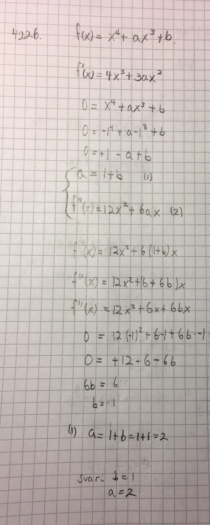 Punkten måste gälla för funktionen och andra derivatan alltså får man två ekvationer. Första då y=f(x) andra där vi vet att en inflextionspunkten har f"(x)=0 och där x är -1 här. Men om kordinaten var t.ex. 2 istället för 0, ska man fortfarande sätta f''(x)=0 för en inflextionspunkt har alltid andra derivatan = 0?