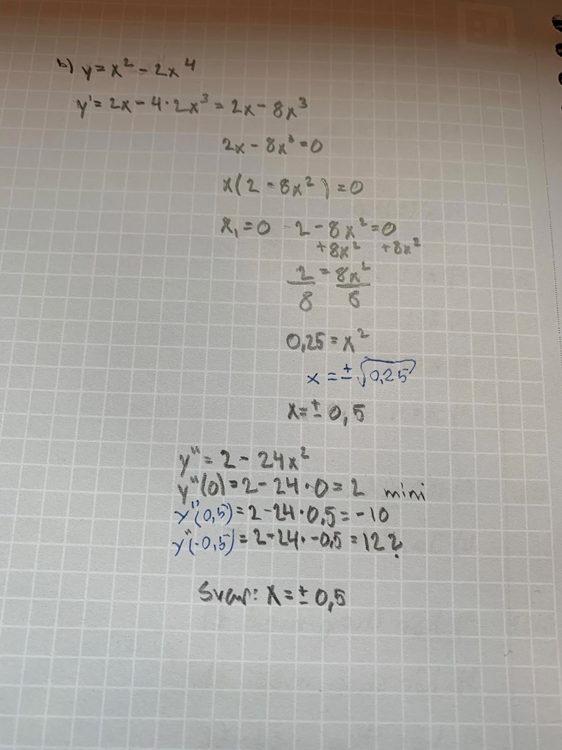 Smaragdalena skrev:Du verkar glömma att x är kvadrerat i andraderivatan. Både (0,5)2 och (-0,5)2 är ju positiva tal.