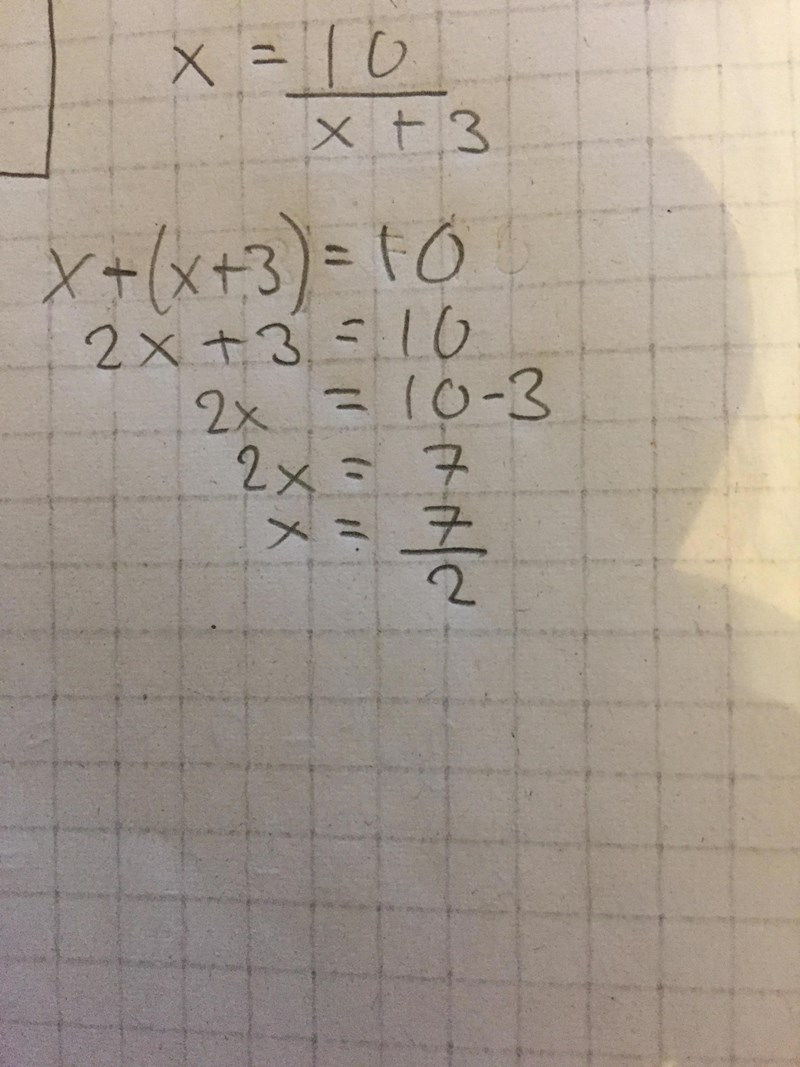 Hade behövt få hjälp med denna andragradsekvation: x=10/x+3. Jag tänkte att man multiplicerar upp (x+3) till vänsterledet sedan så löser man den som vanligt vilket tydligen var fel.