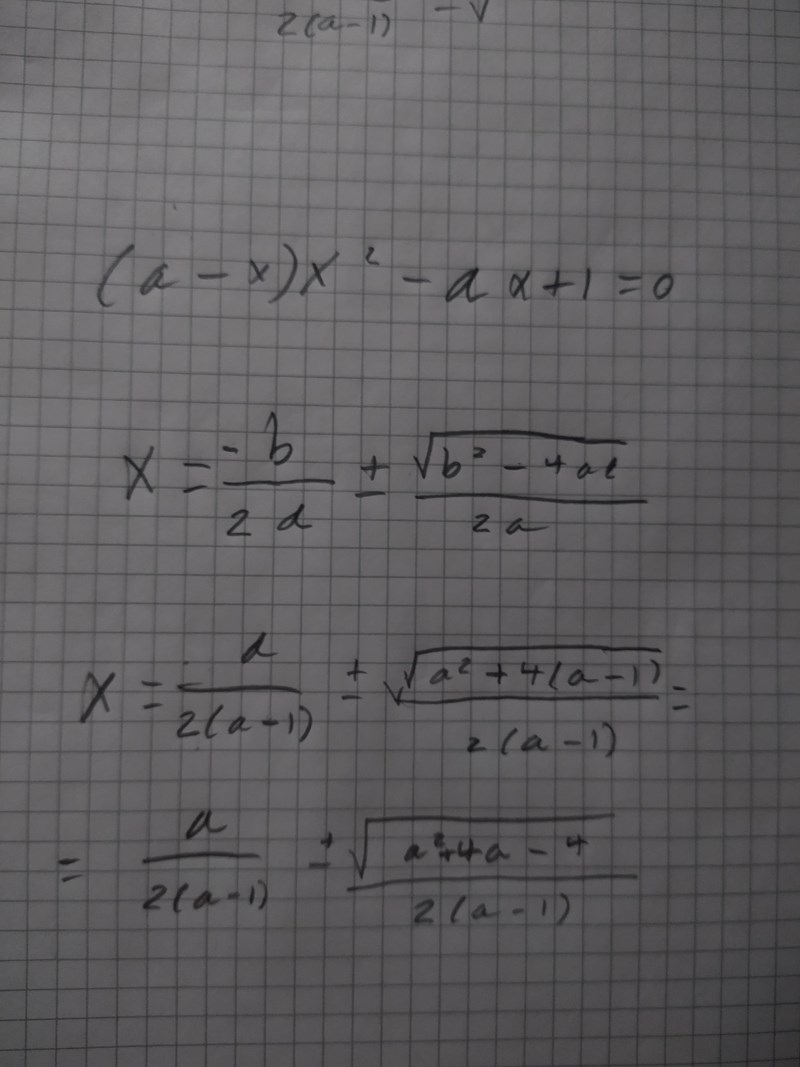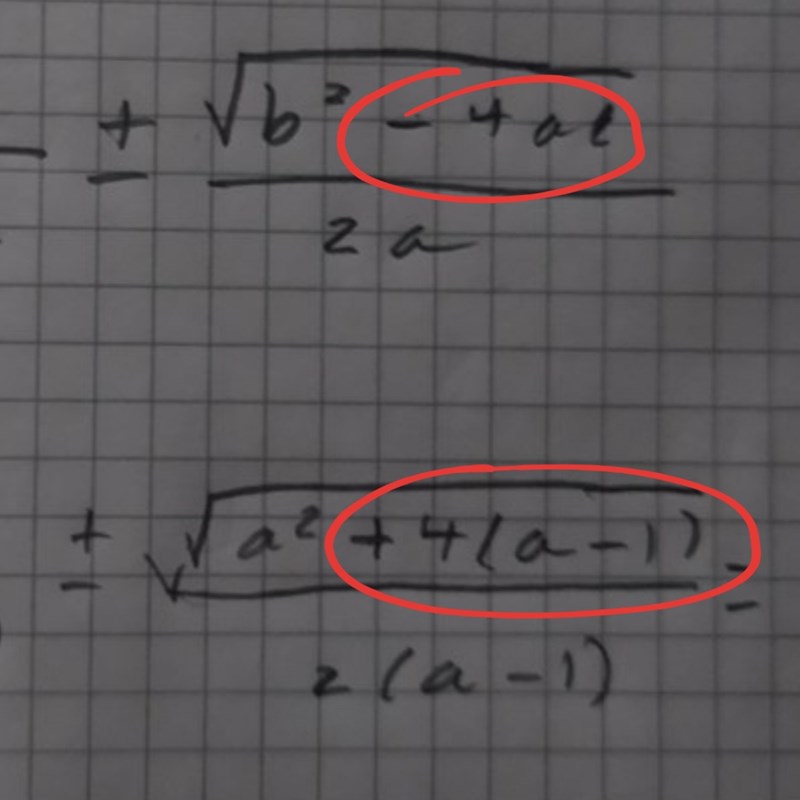 Jag rekommenderar att du kvadratkompletterar eller använder pq-formeln istället för lösningsformeln om ekvationen innehåller någon av symbolerna a,b eller c. Detta flr att slippa sådant som "a=(a-1)".