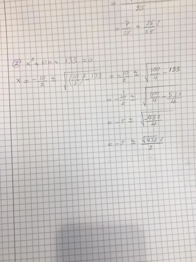 Du har i alla fall inte förenklat tillräckligt. Beräkna 100/4 och 25-133 innan du beräknar roten. (Du kan alternativt beräkna värdet av 432/4 innan du drar roten ur.)