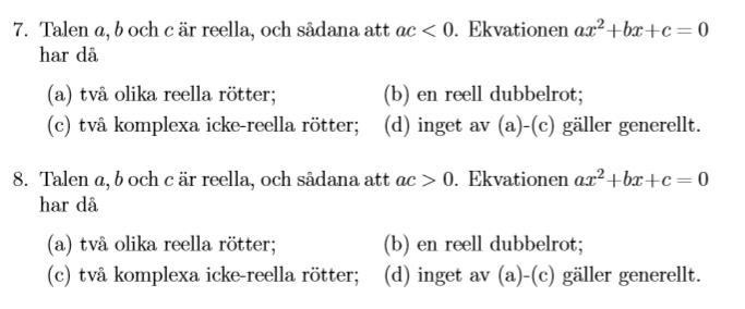 Försökt att lösa pq-formeln och fundera vad som händer om ac<0 eller ac >0, borde inte båda svaren vara alternativ a.