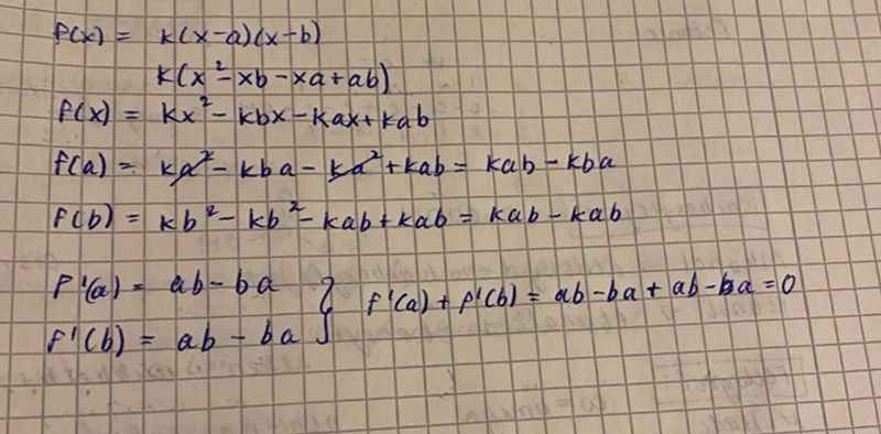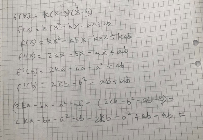 för en andragradsekvation gäller f(x)=k(x-a)(x-b) där f(a) = 0 och f(B) = 0, följande samband gäller f’(a)+f’(b)= 0, förklara grafiskt och algebraiskt”. Detta är min lösning men får det till detta, hur förklarar man det grafiskt?
