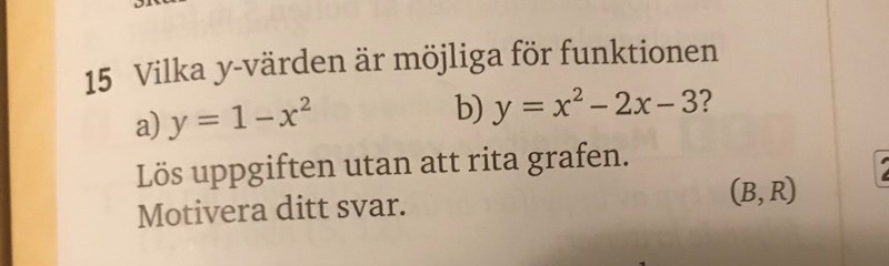 Jag har fastnat på denna frågan Jag vet ju att den första funktionen har en maximipunkt och den andra har minimipunkt men vet inte riktigt hur man ska tänka kring och komma på vilka y-värden som är möjliga för funktionena