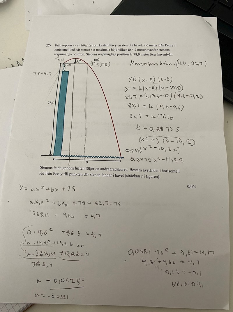 I så fall gäller det att maxpunkten har koordinaterna (9,6; 4,7) och inte (9,6; 82,7) som du har räknat med.