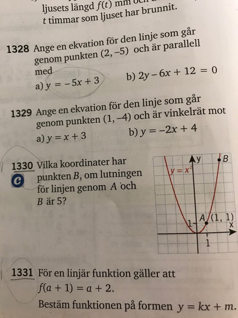 Du har en linje med lutningen 5 (k=5) som går genom punkten (1,1). Denna punkt ligger dessutom på kurvan y=x².