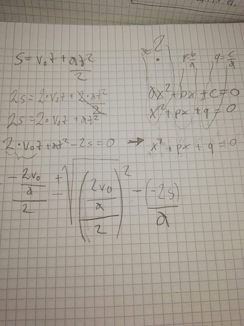 På det här stället tappar jag bort mig. Jag undrar om ax^2 motsvarar a (accelerationen) i min formel, eller om a bara motsvarar a. Förklaringar skriver ax^2 + bx + c = 0 -> x^2 + px + q = 0 , där p= b/a , q = c/a , men man specificerar inte vad a är. är a siffrorna framför x^2?