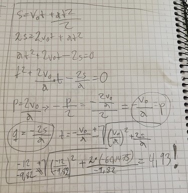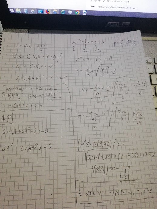 Första delen av uppgiften kunde jag lösa. Sen var detta med andragradsekvationer instoppat typ som en bisats. Tycker det är lite synd nu på ett sätt att man är behörig till fysiken utan någon gymnasiematte. Jag har visserligen matte a och b i bagaget, men för samhäll tidigt 2000-tal. Vettef-n hur jag fick mvg respektive vg i dem, men det verkar ju i alla fall inte räcka till fysik a..