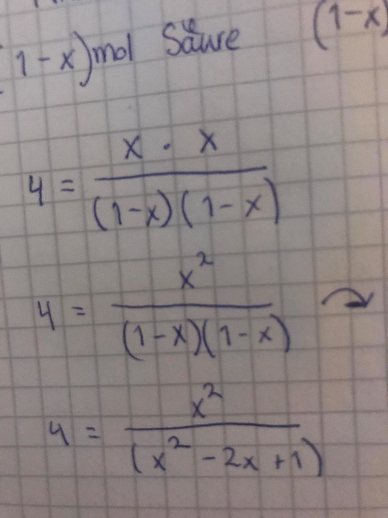 Du kan multiplicera allt med x^2-2x+1 så får du en andragradsekvation. Men du behövde inte utföra kvadreringen av 1-x: det är en kvadrat i täljaren och en kvadrat i nämnaren och ett tal i vänsterledet (en kvadrat, t o m) så det är bara att dra roten ur allting: = och fortsätta därifrån.