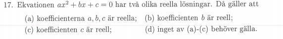 Hur ska man tänka här? Jag försökte först med abc formeln och kom inte fram till mycket. Sen tänkte jag att man kan omvandla det till det komplexa talplanet där b och c kan vara icke-reella men a måste vara reellt?
