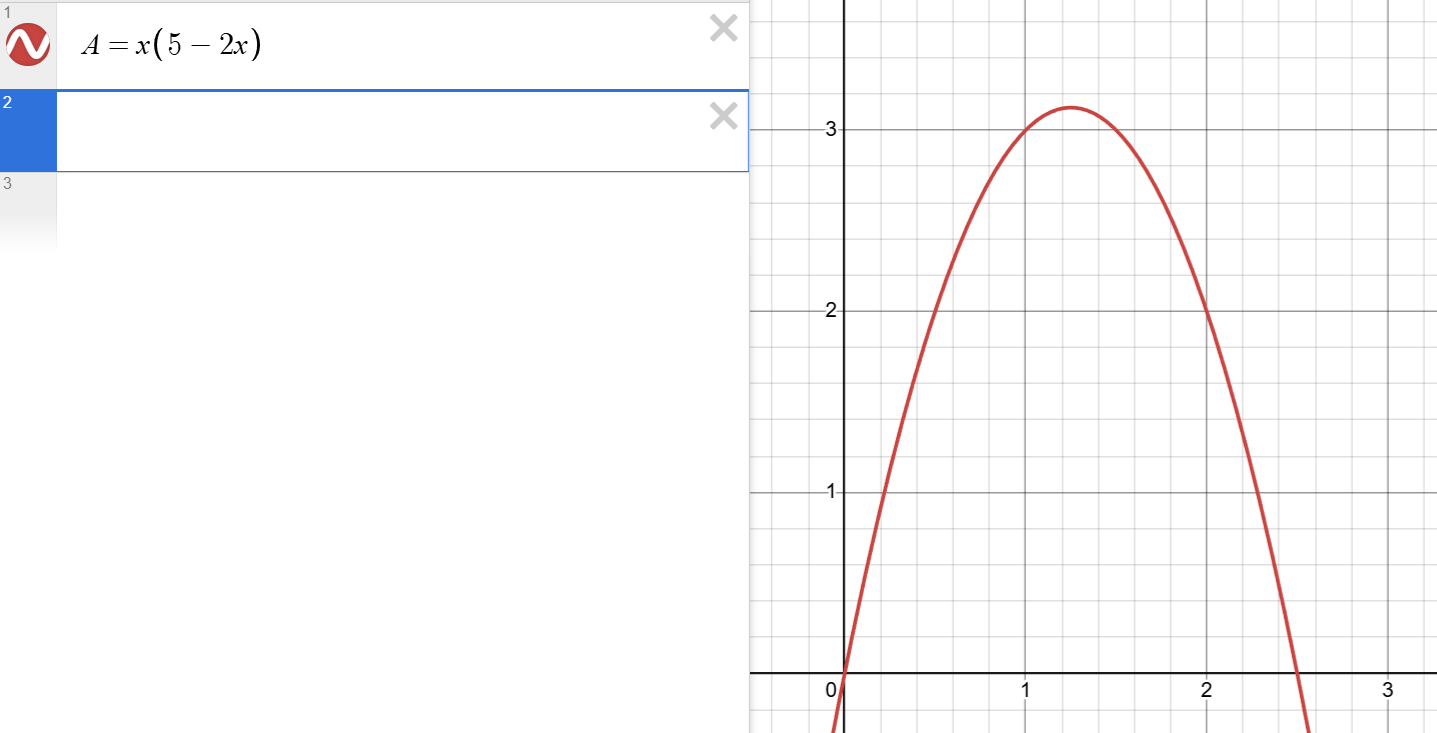 Arean för en rektangel är ju basen * höjden, så vi kan sätta upp ett uttryck för den: A=x(5-2x). Så här ser den ut: