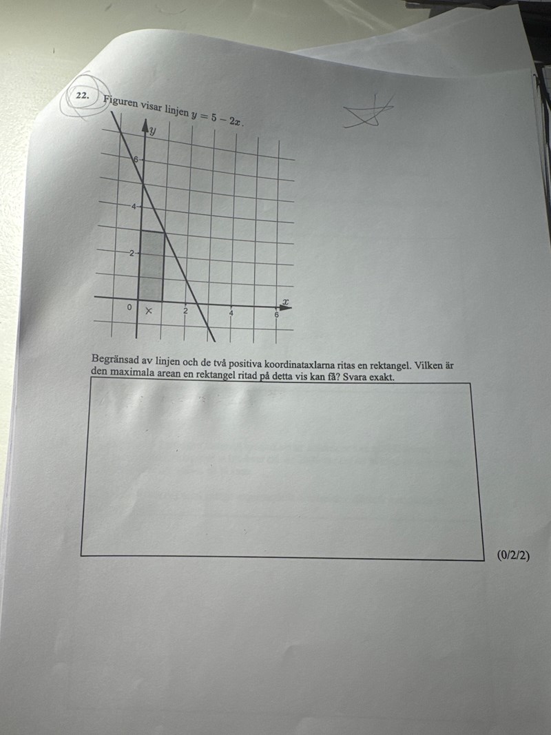 Man ser i figuren att rektangelns area är noll för x=0 och x=2,5.
