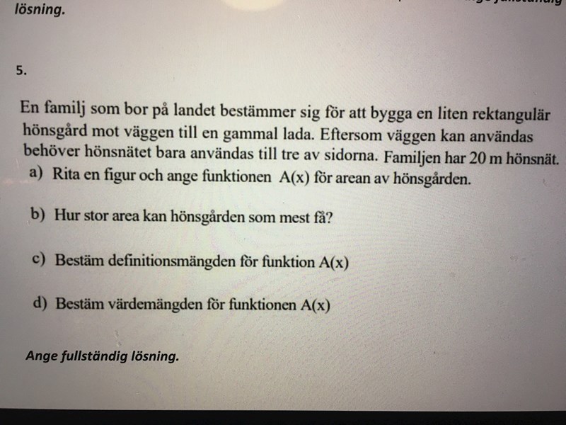 Denna uppgift har jag svårt med då jag inte har någon aning om vad eller hur jag sak göra. Skulle någon kunna hjälpa och förklara detta med hjälp av detta exempel (alla frågor; a,b,c,d)? Har flera liknande uppgifter men kan använda detta som ett exempel. Jag har tyvärr missat mycket av matematik tidigare och har därför väldigt svårt för många uppgifter. Även om jag förstår att definitionsmängd och värdemängd är något som jag borde kunna, kan jag det inte, trots försök till att läsa mig till det och videor. Se bild nedan. Tacksam för svar och hjälp!