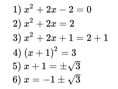 Man använder kvadreringsregeln baklänges. Idén är att justera uttrycket så att det stämmer med kvadreringsregeln. De tal man "får över" flyttar man till höger led: