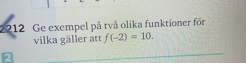 Annars kan du bara sätta f(x) = k1x+m1 och g(x) = k2x+m2 och välja konstanter så att f(-2) = 10 och g(-2) = 10.