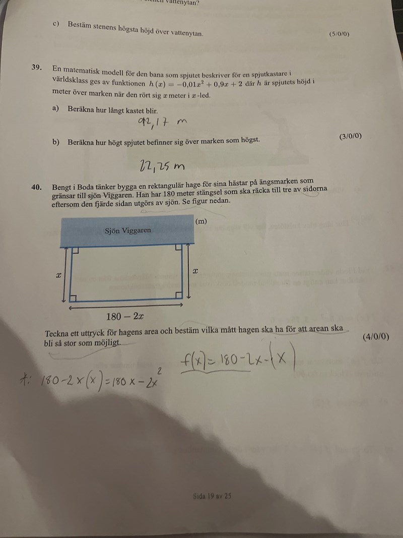 Fråga 40) Förstår inte hur jag ska räkna ut hur stora sidorna skall vara? Förstår att det ska bli f(x)=(x)180x-2x