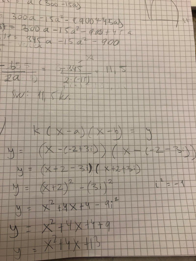 En andragradsfunktion f har de komplexa nollställena X1 = -2+3i och x2= -2-3i. Ange funktionsuttrycket."